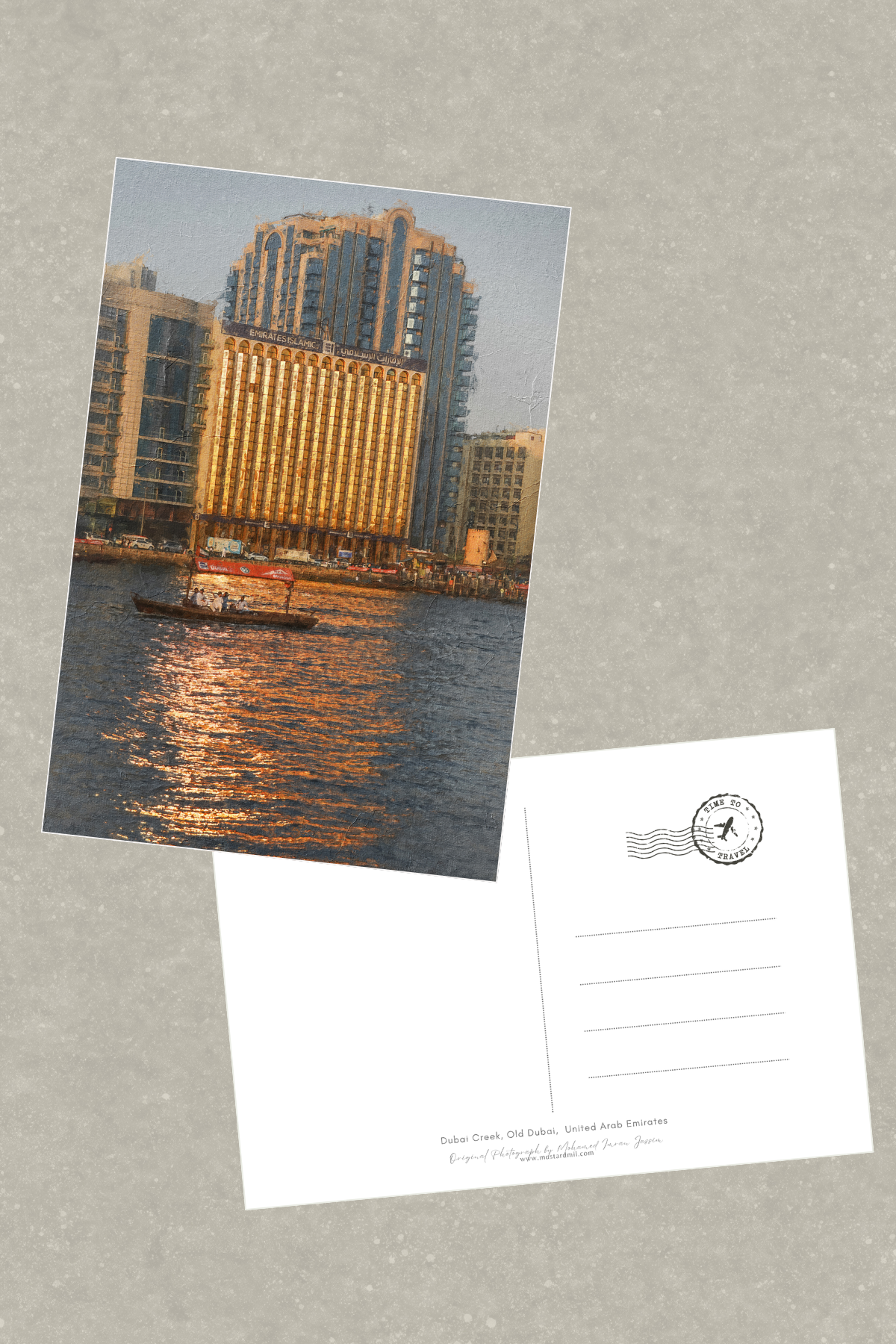 In the foreground, a traditional Abra boat makes its way across the water, bridging the gap between Deira and Bur Dubai. The rich, golden tones and textured finish make this card feel like a memory preserved in time.